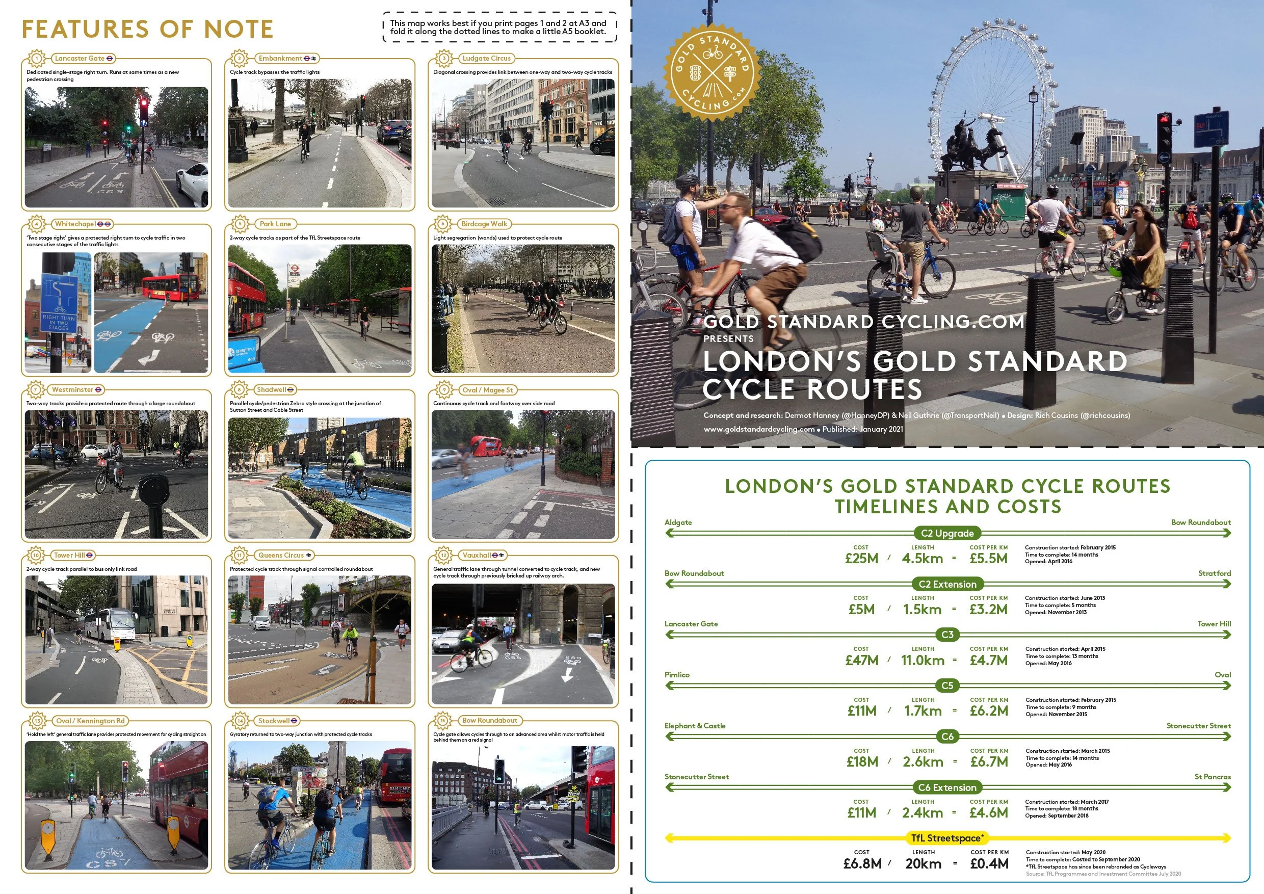 Please click on the link to download the full ‘Gold Standard’ cycle map of London guide. We have also set up the guide to allow for printing of the Core Map on pages 1 and 2 as a pocket guide. This way, you can have key cycling information and locations to hand as you move around central London.
