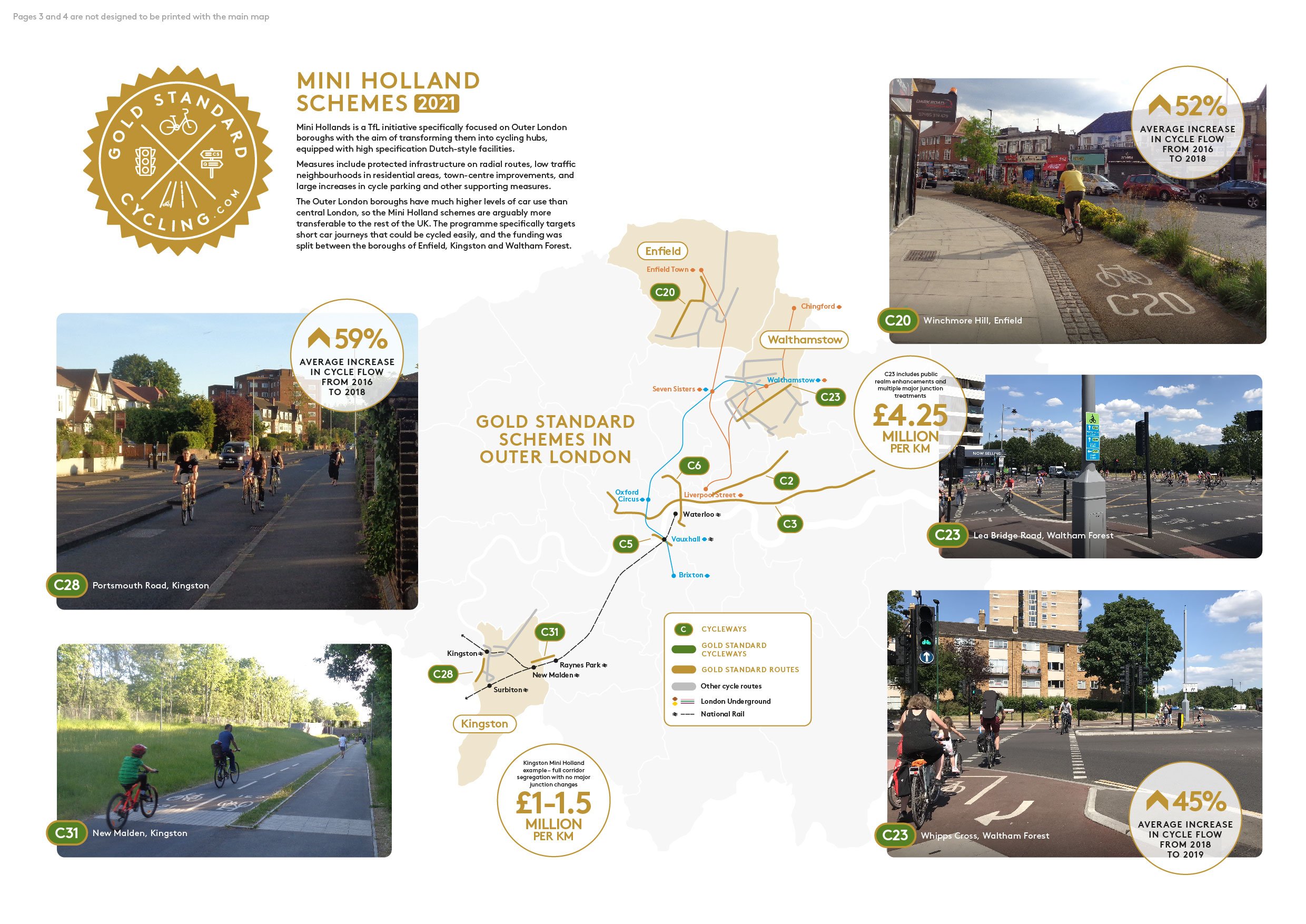 The Mini-Holland section highlights the three boroughs of Outer London (Enfield, Waltham Forest and Kingston) that each received £30m of TfL funding to develop focused high-quality cycling provision. We were keen to include these examples to show how the new generation of facilities can also work in more car-dependent areas with lower levels of cycle use and narrower streets – conditions in central London are much less transferable to other parts of the country. We’ve included some key information and photographs to highlight how quality cycling infrastructure is also available in Outer London, and that ‘gold standard’ schemes can be achieved in a range of settings.